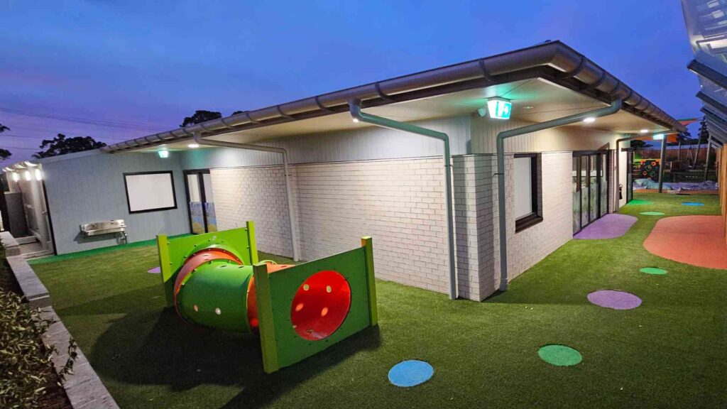 New build Childcare – Completed external cladding and internal partitions packages, external FC eaves, V groove cladding, Decowood timber look aluminium panels, internal aluminium, doors, skirting and plastering works.